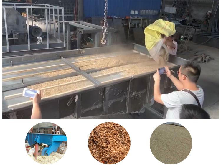 啟動機(jī)器,含有雜質(zhì)或有多種粒度的木屑被倒入木屑振動篩中后,同頻逆向電機(jī)產(chǎn)生的激振力讓木屑在篩網(wǎng)上散開并向前運(yùn)動,運(yùn)動過程中,木粉或石子等小顆粒的雜質(zhì)會漏到下方篩網(wǎng),大粒徑的木屑留在上層,達(dá)到篩分或除雜的目的。