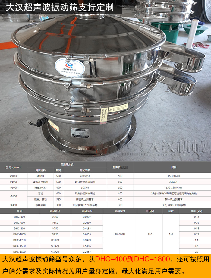 新鄉(xiāng)大漢超聲波振動(dòng)篩型號(hào)眾多,從DHC-400到DHC-1800,還可按照用戶篩分需求及實(shí)際情況為用戶量身定做,大化滿足用戶需要。