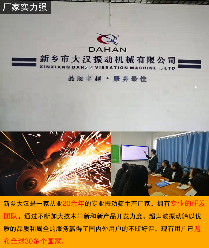 新鄉(xiāng)大漢是一家從業(yè)20余年的專業(yè)振動(dòng)篩生產(chǎn)廠家,擁有專業(yè)的研發(fā)團(tuán)隊(duì),通過不斷加大技術(shù)革新和新產(chǎn)品開發(fā)力度,超聲波振動(dòng)篩以優(yōu)質(zhì)的品質(zhì)和周全的服務(wù)贏得了國內(nèi)外用戶的不斷好評,現(xiàn)有用戶已遍布全球30多個(gè)國家。