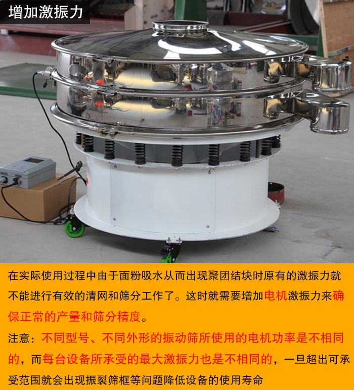 為振動篩提供動力源的是振動電機(jī),而面粉振動篩都是按照用戶的要求進(jìn)行設(shè)計(jì)生產(chǎn)的。但在實(shí)際使用過程中由于面粉吸水從而出現(xiàn)聚團(tuán)結(jié)塊時(shí)原有的激振力就不能進(jìn)行有效的清網(wǎng)和篩分工作了。這時(shí)就需要增加電機(jī)激振力來確保正常的產(chǎn)量和篩分精度。但我們要注意的是:不同型號、不同外形的振動篩所使用的電機(jī)功率是不相同的,而每臺設(shè)備所承受的大激振力也是不相同的,一旦超出可承受范圍就會出現(xiàn)振裂篩框等問題降低設(shè)備的使用壽命。所以用戶在調(diào)節(jié)時(shí)請?zhí)崆白稍兡墓?yīng)商。