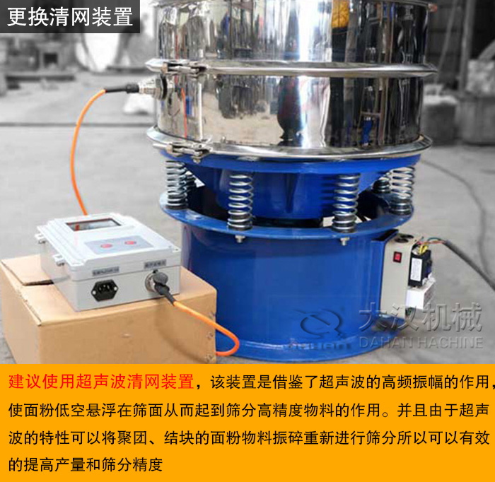 清網(wǎng)裝置是為了解決振動篩在生產(chǎn)過程中物料堵塞篩網(wǎng)的裝置,常用到的是彈跳球清網(wǎng)裝置,該裝置是以擊打篩面為原理來進(jìn)行清理篩網(wǎng)的,但由于電機(jī)激振力的原因彈跳球?qū)τ诰蹐F(tuán)結(jié)塊物料的清理就不是很明顯了,而如果增加激振力雖然可以起到清網(wǎng)的效果但長時(shí)間的巨力擊打篩網(wǎng)就會降低篩網(wǎng)使用壽命。所以需要一個(gè)新型的清網(wǎng)裝置。這里小編建議使用超聲波清網(wǎng)裝置,該裝置是借鑒了超聲波的高頻振幅的作用,當(dāng)振動篩做三維運(yùn)動的同時(shí)受到超聲波篩分系統(tǒng)作用在篩面的高頻率低振幅的超聲振動波,使面粉低空懸浮在篩面從而起到篩分高精度物料的作用。并且由于超聲波的特性可以將聚團(tuán)、結(jié)塊的面粉物料振碎重新進(jìn)行篩分所以可以有效的提高產(chǎn)量和篩分精度。