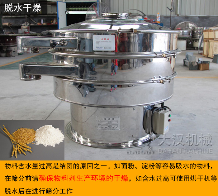 物料含水量過高是結(jié)團(tuán)的原因之一。如面粉、淀粉等容易吸水的物料,在篩分前請確保物料劑生產(chǎn)環(huán)境的干燥,如含水過高可使用烘干機(jī)等脫水后在進(jìn)行篩分工作。