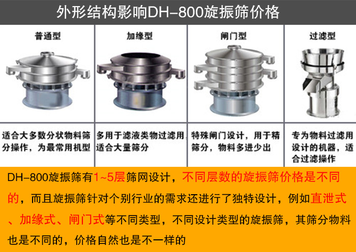DH-800旋振篩有1~5層篩網(wǎng)設(shè)計(jì),不同層數(shù)的旋振篩價格是不同的,而且旋振篩針對個別行業(yè)的需求還進(jìn)行了獨(dú)特設(shè)計(jì),例如直泄式、加緣式、閘門式等不同類型,不同設(shè)計(jì)類型的旋振篩,其篩分物料也是不同的,價格自然也是不一樣的。