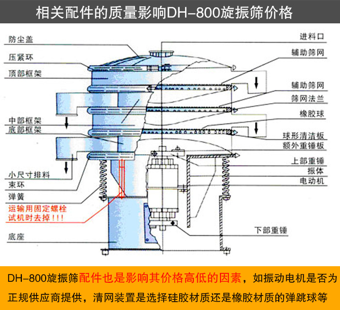 DH-800旋振篩配件也是影響其價格高低的因素,如振動電機(jī)是否為正規(guī)供應(yīng)商提供,清網(wǎng)裝置是選擇硅膠材質(zhì)還是橡膠材質(zhì)的彈跳球等。