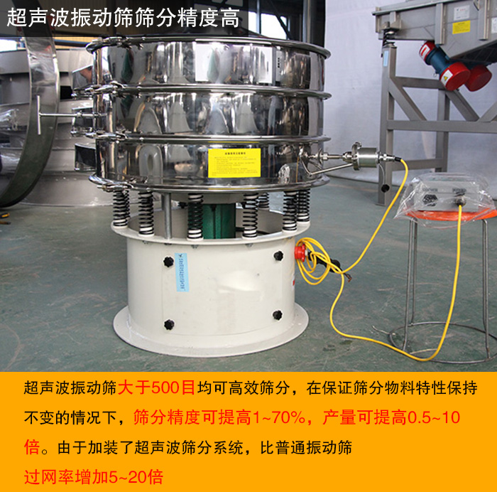 超聲波振動篩大于500目均可高效篩分,在保證篩分物料特性保持不變的情況下,篩分精度可提高1~70%產(chǎn)量可提高0.5~10倍。由于加裝了超聲波篩分系統(tǒng),可有效分解粘附物質(zhì),減少篩上物,比普通振動篩過網(wǎng)率增加5~20倍。