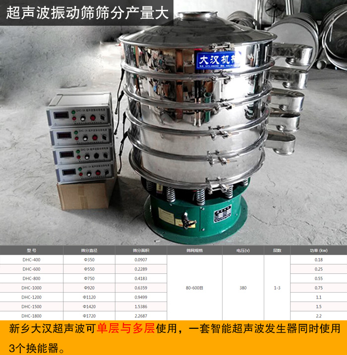 新鄉(xiāng)大漢超聲波可單層與多層使用,一套智能超聲波發(fā)生器同時使用3個換能器,具備自潔功能,無網(wǎng)孔堵塞現(xiàn)象,對于一些難篩分的物料有著良好的篩分效果。