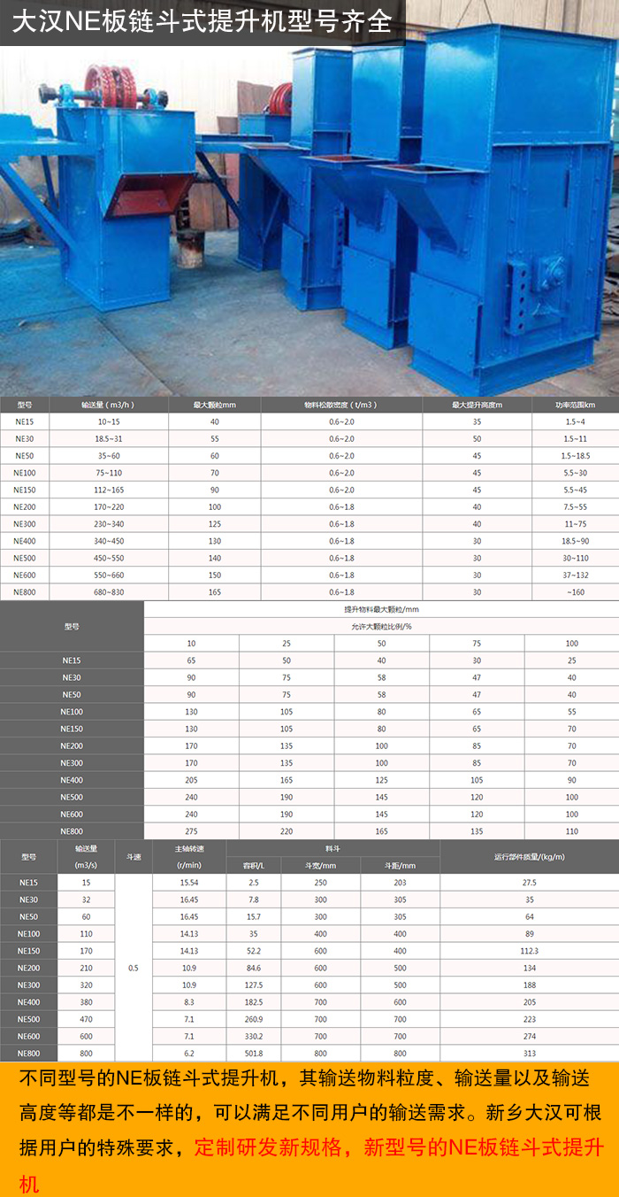 大漢NE板鏈斗式提升機(jī)共有11種型號(hào):NE15、NE30、NE50、NE150、NE200、NE300、NE400、NE500、NE600、NE800。不同型號(hào)的NE板鏈斗式提升機(jī),其輸送物料粒度、輸送量以及輸送高度等都是不一樣的,可以滿足不同用戶的輸送需求。另外,新鄉(xiāng)大漢可根據(jù)用戶的特殊要求,定制研發(fā)新規(guī)格,新型號(hào)的NE板鏈斗式提升機(jī),以大化滿足用戶的一切需求。