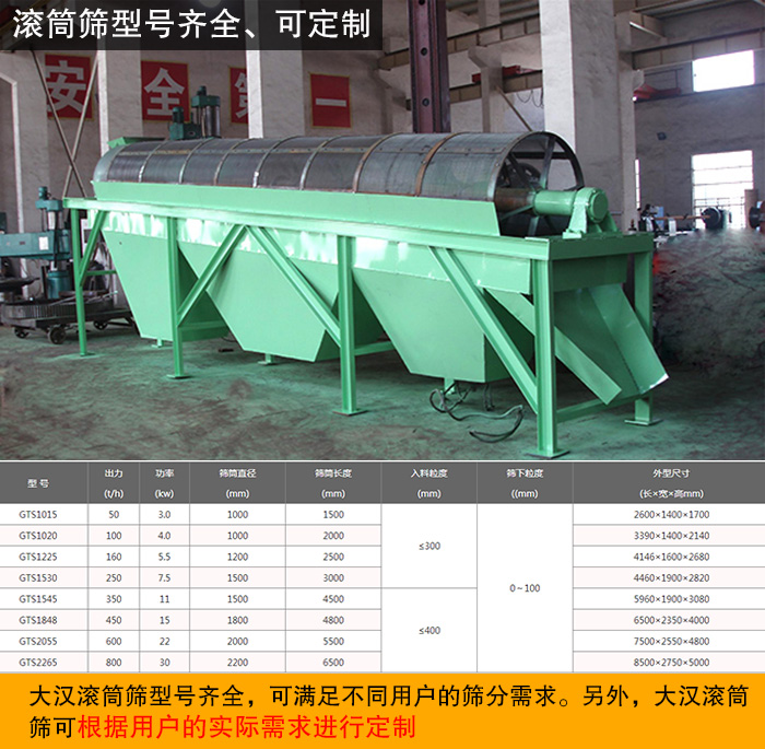 新鄉(xiāng)大漢滾筒篩型號(hào)有GTS1015、GTS1020、GTS1225、GTS1530、GTS1545、GTS1848、GTS2055、GTS2265等。不同型號(hào)的滾筒篩,其處理能力是不同的,大漢滾筒篩型號(hào)齊全,可滿足不同用戶(hù)的篩分需求。另外,大漢滾筒篩可根據(jù)用戶(hù)的實(shí)際需求進(jìn)行定制。