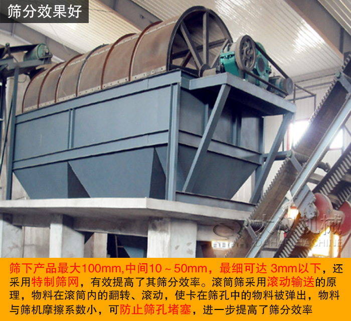 滾筒篩經(jīng)減速器與滾筒裝置通過聯(lián)軸器連接在一起,驅(qū)動滾筒裝置繞其軸線轉(zhuǎn)動。當物料進入滾筒裝置后,由于滾筒裝置的傾斜與轉(zhuǎn)動,使篩面上的物料翻轉(zhuǎn)與滾動的同時,自上而下通過分級篩網(wǎng)析出,由于篩網(wǎng)規(guī)格不同,物料直接被分離篩選,篩分效率高,篩下產(chǎn)品大100mm,中間10~50mm,細可達 3mm以下,還采用特制篩網(wǎng),有效提高了其篩分效率。滾筒篩采用滾動輸送的原理,物料在滾筒內(nèi)的翻轉(zhuǎn)、滾動,使卡在篩孔中的物料被彈出,物料與篩機摩擦系數(shù)小,可防止篩孔堵塞,進一步提高了篩分效率。