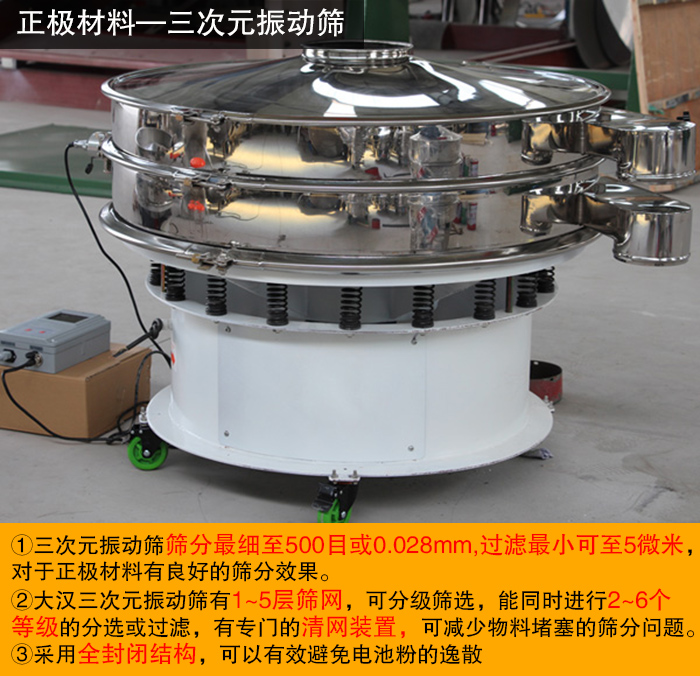 正極材料的鋰電池主要是鋰鐵磷酸鹽,多為顆粒狀,所以大漢推薦大家使用三次元振動篩。