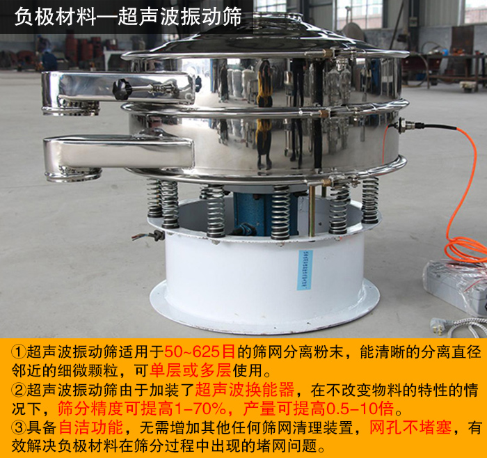負(fù)極材料的鋰電池主要是石墨,是一種細(xì)度較高的物料,普通的振動篩在實際篩分過程中會出現(xiàn)堵網(wǎng)等問題,所以大漢廠家推薦使用超聲波振動篩進(jìn)行篩分。