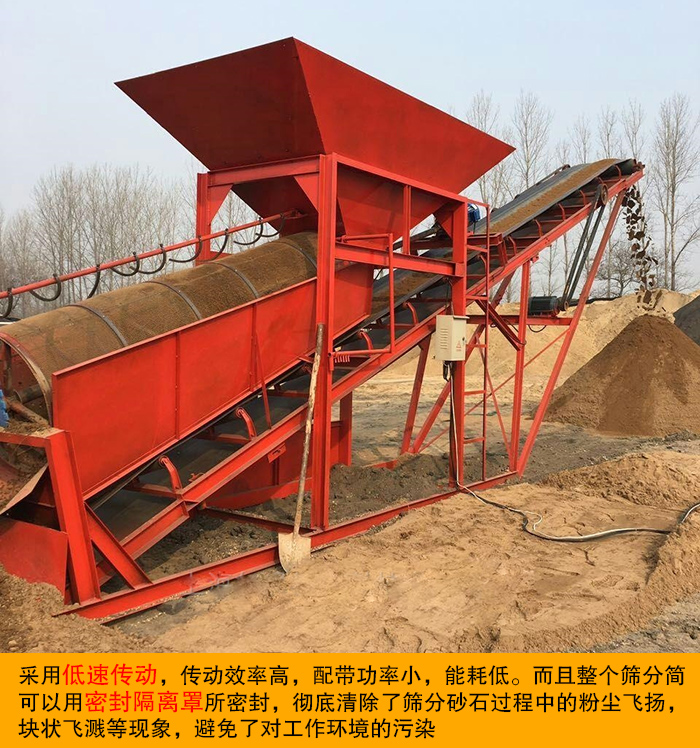 砂石滾筒篩整機(jī)運(yùn)行安全可靠,采用低速傳動(dòng),傳動(dòng)效率高,配帶功率小,能耗低。而且整個(gè)篩分簡(jiǎn)可以用密封隔離罩所密封,清除了篩分砂石過(guò)程中的粉塵飛揚(yáng),塊狀飛濺等現(xiàn)象,避免了對(duì)工作環(huán)境的污染。
