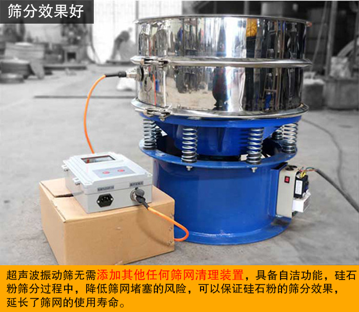 超聲波振動(dòng)篩是將220V、50Hz或110V、60Hz電能轉(zhuǎn)化為18KHz的高頻電能,輸入超聲換能器,將其變成18KHz機(jī)械振動(dòng),大大提高了振動(dòng)篩的各種效果,從而達(dá)到高效篩分和清網(wǎng)的目的。超聲波振動(dòng)篩無需添加其他篩網(wǎng)清理裝置,具備自潔功能,硅石粉篩分過程中,降低篩網(wǎng)堵塞的風(fēng)險(xiǎn),可以保證硅石粉的篩分效果,延長了篩網(wǎng)的使用壽命。