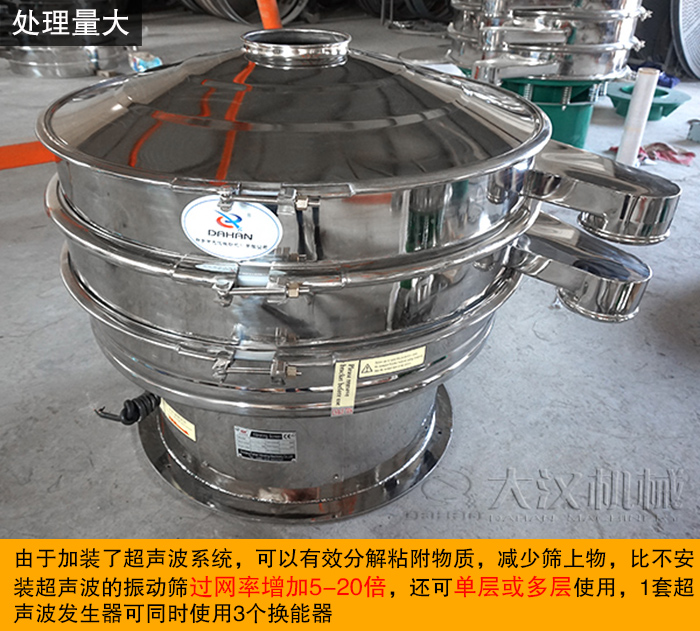 超聲波振動(dòng)篩由于加裝了超聲波系統(tǒng),可以有效分解粘附物質(zhì),減少篩上物,比不安裝超聲波的振動(dòng)篩過網(wǎng)率增加5-20倍,還可單層或多層使用,1套超聲波發(fā)生器可同時(shí)使用3個(gè)換能器。