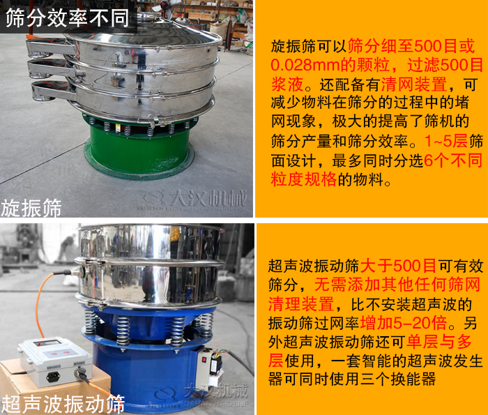 超聲波振動篩是在旋振篩基礎上及加裝超聲波裝置,因此相比旋振篩更加適合于粒度更細、粘度更大、易結(jié)團、高靜電、高精細、高密度、比重輕的粉狀物料,大于500目篩分。