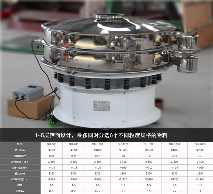 旋振篩有1~5層篩面設(shè)計(jì),多同時(shí)分選6個(gè)不同粒度規(guī)格的物料,處理量大。