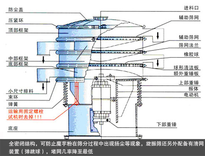 旋振篩采用立式振動電機作為激振源,通過振動電機上下兩端的偏心重錘將旋轉(zhuǎn)運動轉(zhuǎn)變?yōu)樗?、垂直、傾斜的三次元運動,并傳遞到旋振篩的篩面上,魔芋粉通過入料口進入設(shè)備內(nèi),根據(jù)不同的篩分要求,魔芋粉經(jīng)過1-5層不同目數(shù)的篩網(wǎng)的篩分層,在這個過程中,位于各層的篩網(wǎng)下的清網(wǎng)裝置不斷撞擊篩網(wǎng),使魔芋粉能夠順暢的篩分,并有效避免魔芋粉堵網(wǎng)問題的出現(xiàn),不同目數(shù)的魔芋粉通過各層對應(yīng)目數(shù)的篩網(wǎng)或經(jīng)設(shè)置在各層的出料口排出,終實現(xiàn)對魔芋粉的篩選或過濾。
