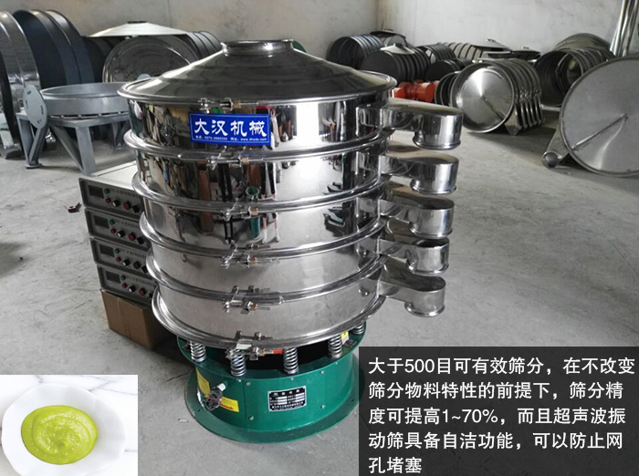 超聲波振動(dòng)篩大于500目可有效篩分,在不改變篩分物料特性的前提下,篩分精度可提高1~70%,而且超聲波振動(dòng)篩具備自潔功能,無(wú)需增加的清網(wǎng)裝置,既可以防止網(wǎng)孔堵塞,又可以提高芥末粉的篩分精度。