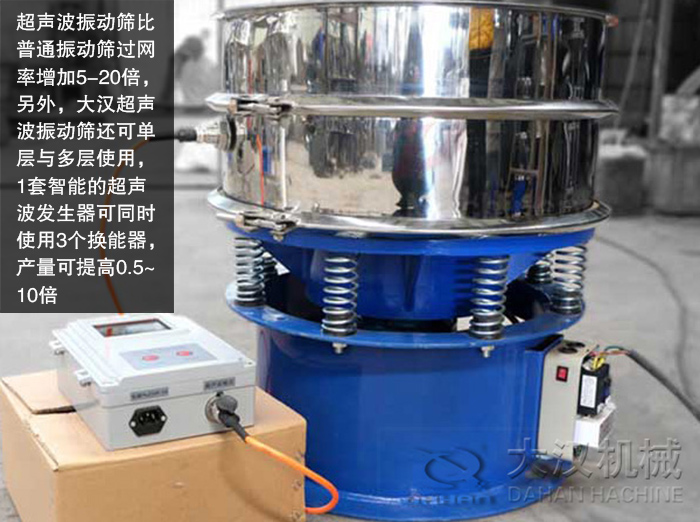 超聲波振動(dòng)篩可有效分解粘附物質(zhì),減少篩上物,比普通振動(dòng)篩過(guò)網(wǎng)率增加5-20倍,另外,大漢超聲波振動(dòng)篩還可單層與多層使用,1套智能的超聲波發(fā)生器可同時(shí)使用3個(gè)換能器,產(chǎn)量可提高0.5~10倍。