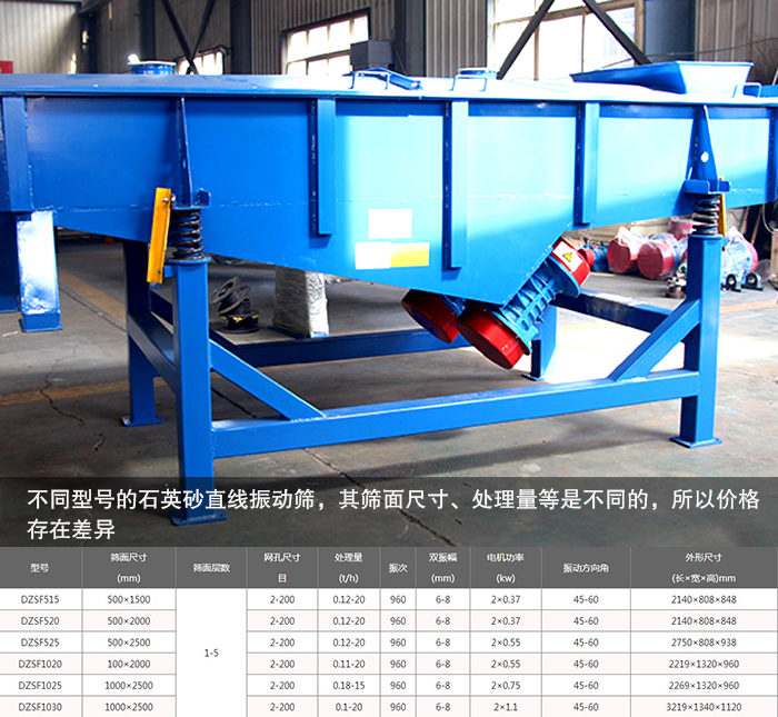 大漢石英砂直線振動(dòng)篩型號(hào)包括DZSF515、DZSF520、DZSF525、DZSF1020、DZSF1025、DZSF1030多種型號(hào),不同型號(hào)的石英砂直線振動(dòng)篩,其篩面尺寸、處理量等是不同的,所以價(jià)格存在差異,用戶需要更加產(chǎn)能大小進(jìn)行合理選擇。