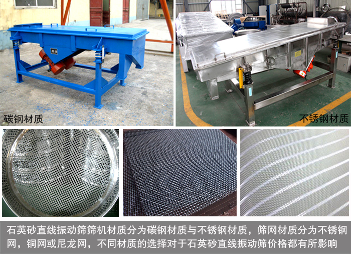 石英砂直線振動(dòng)篩篩機(jī)材質(zhì)分為碳鋼材質(zhì)與不銹鋼材質(zhì),篩網(wǎng)材質(zhì)分為不銹鋼網(wǎng),銅網(wǎng)或尼龍網(wǎng)。不同材質(zhì)的選擇對(duì)于石英砂直線振動(dòng)篩價(jià)格都有所影響,具體情況需要結(jié)合用戶實(shí)際選情況進(jìn)行選擇。
