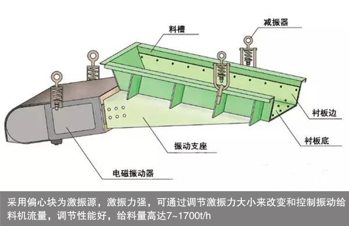 大漢振動給料機(jī)配置提供各種非標(biāo)和工藝配套件,調(diào)節(jié)給料量十分方便,無沖料現(xiàn)象。采用偏心塊為激振源,激振力強,可通過調(diào)節(jié)激振力大小來改變和控制振動給料機(jī)流量,調(diào)節(jié)性能好,給料量高達(dá)7~1700t/h。