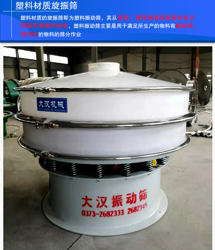 塑料材質(zhì)的旋振篩即為塑料振動(dòng)篩,其從篩框、篩網(wǎng)到清網(wǎng)裝置完全采用聚丙烯塑料材質(zhì),塑料振動(dòng)篩主要是用于滿足所生產(chǎn)的物料有酸堿性、腐蝕性的物料的篩分作業(yè),排除了一些特殊物料與金屬接觸會(huì)產(chǎn)生化學(xué)反應(yīng)的問題。