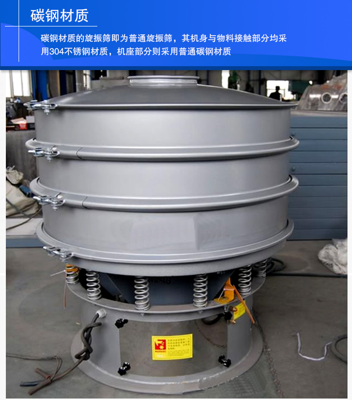 碳鋼材質(zhì)的旋振篩即為普通旋振篩,其機(jī)身與物料接觸部分均采用304不銹鋼材質(zhì),機(jī)座部分則采用普通碳鋼材質(zhì)。旋振篩可以篩分500目或或0.028mm的顆粒,過濾500目漿液。