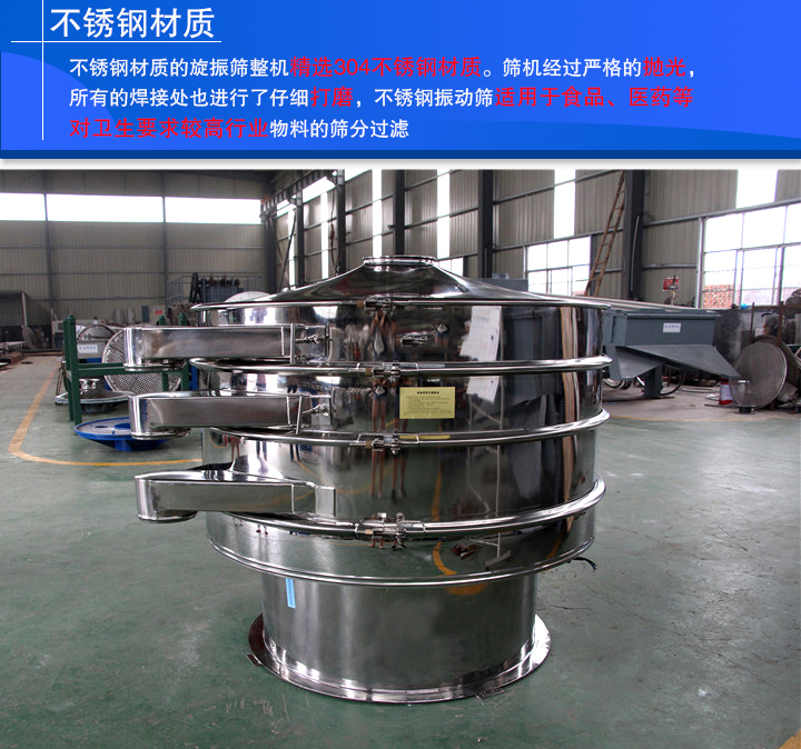 不銹鋼材質(zhì)的旋振篩即為不銹鋼振動(dòng)篩,其整機(jī)精選304不銹鋼材質(zhì)。篩機(jī)經(jīng)過嚴(yán)格的拋光,所有的焊接處也進(jìn)行了仔細(xì)打磨,不銹鋼振動(dòng)篩適用于食品、醫(yī)藥等對(duì)衛(wèi)生要求較高行業(yè)?物料的篩分過濾。