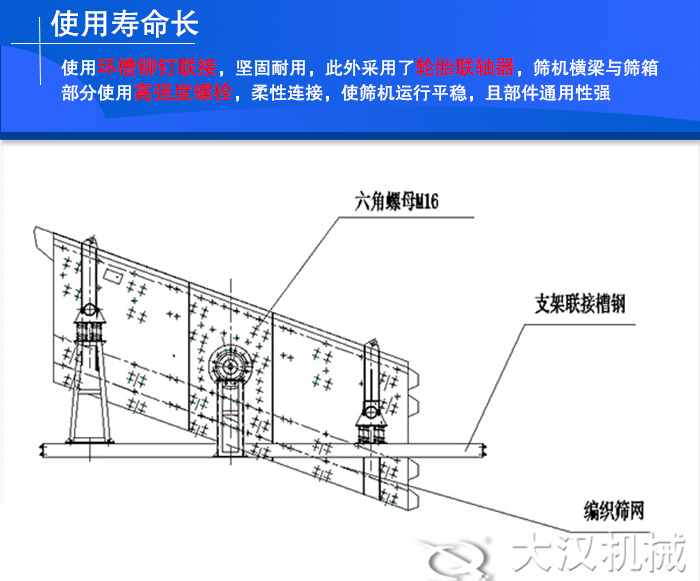 YA/YK圓振動(dòng)篩使用環(huán)槽鉚釘聯(lián)接,堅(jiān)固耐用,此外采用了輪胎聯(lián)軸器,篩機(jī)橫梁與篩箱部分使用高強(qiáng)度螺栓,柔性連接,使篩機(jī)運(yùn)行平穩(wěn),且部件通用性強(qiáng),維修快捷方便,使用壽命長(zhǎng)。