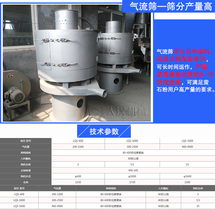 氣流篩可與各種磨機,風(fēng)路并網(wǎng)配套使用,可長時間運作,產(chǎn)量是普通振動篩的5-10倍或更高,可滿足螢石粉用戶高產(chǎn)量的要求。