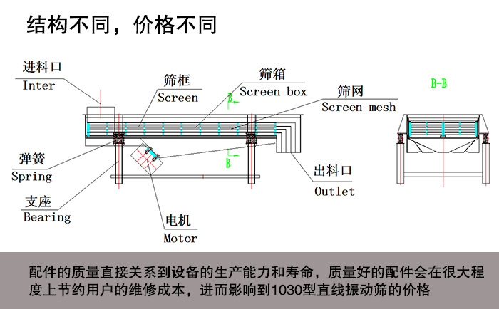 1030型直線振動(dòng)篩配件主要振動(dòng)電機(jī)、減震彈簧、篩網(wǎng)、清網(wǎng)裝置等,配件的質(zhì)量直接關(guān)系到設(shè)備的生產(chǎn)能力和壽命,質(zhì)量好的配件會(huì)在很大程度上節(jié)約用戶(hù)的維修成本,進(jìn)而影響到1030型直線振動(dòng)篩的價(jià)格。