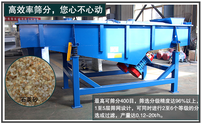 大漢石英砂振動篩篩分高效,高可篩分400目,篩選分級精度達96%以上,1至5層篩網(wǎng)設計,可同時進行2至6個等級的分選或過濾,產(chǎn)量達0.12~20t/h,用戶使用更安心。