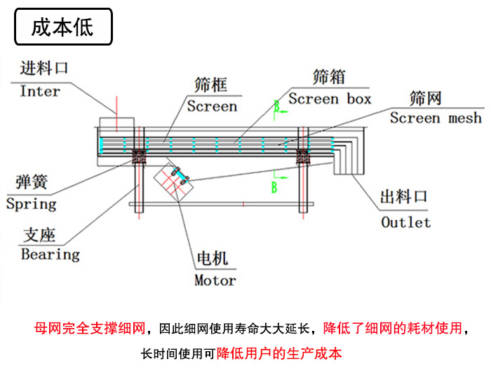 直線振動(dòng)篩采用了獨(dú)特的篩網(wǎng)結(jié)構(gòu)設(shè)計(jì),其母網(wǎng)完全支撐細(xì)網(wǎng),因此細(xì)網(wǎng)使用壽命大大延長(zhǎng),降低了細(xì)網(wǎng)的耗材使用,長(zhǎng)時(shí)間使用可降低用戶的生產(chǎn)成本。而且用戶更換篩網(wǎng)更加方便快捷,只需3-5分鐘,并且篩機(jī)設(shè)計(jì)合理,精巧和容易裝配,一人即可操作篩機(jī),既可以節(jié)省客戶時(shí)間,又減少了人工勞動(dòng)力。