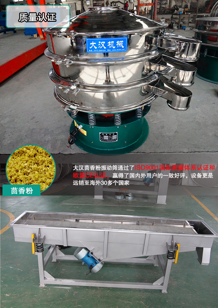 茴香粉振動(dòng)篩哪里購(gòu)買?選擇新鄉(xiāng)大漢靠譜,不僅設(shè)備質(zhì)量有保障,而且服務(wù)好,價(jià)格優(yōu)惠,所以需要茴香粉振動(dòng)篩的用戶們可以選擇來(lái)大漢進(jìn)行采購(gòu)。