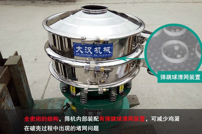 不銹鋼振動(dòng)篩采用了全密閉的結(jié)構(gòu),篩機(jī)內(nèi)部裝配有彈跳球清網(wǎng)裝置,可以在篩機(jī)工作時(shí)對篩面進(jìn)行清潔處理,減少雞蛋在破殼過程中出現(xiàn)的堵網(wǎng)問題,進(jìn)一步提高其篩分效率。