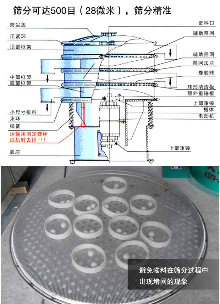 大漢不銹鋼旋振篩篩分可達(dá)500目(28微米),篩機(jī)內(nèi)部裝配有彈跳球清網(wǎng)裝置,可對(duì)篩面進(jìn)行清潔處理,進(jìn)一步提高篩分精度。