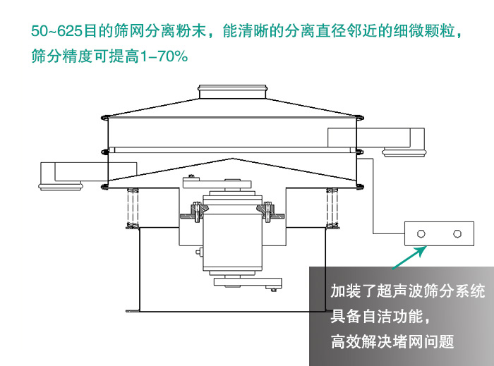 由于加裝了超聲波篩分系統(tǒng),具備自潔功能,可以高效解決強(qiáng)吸附性、易團(tuán)聚、高靜電、高精細(xì)、高密度、輕比重等篩分難題,解決物料在篩分過程中的堵網(wǎng)問題。