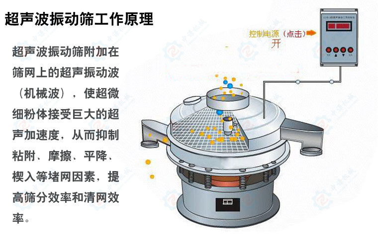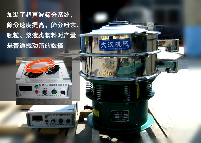 超聲波振動(dòng)篩是在旋振篩產(chǎn)品的基礎(chǔ)上設(shè)計(jì)增加了一套超聲波裝置(即超聲波電源,超聲波換能器),可將各種常用的低頻電能轉(zhuǎn)化為高達(dá)38KHz的高頻電能,再通過(guò)超聲換能器,終得到一個(gè)38KHz機(jī)械振動(dòng),可以高效解決篩網(wǎng)堵塞風(fēng)險(xiǎn),提高篩分效率。