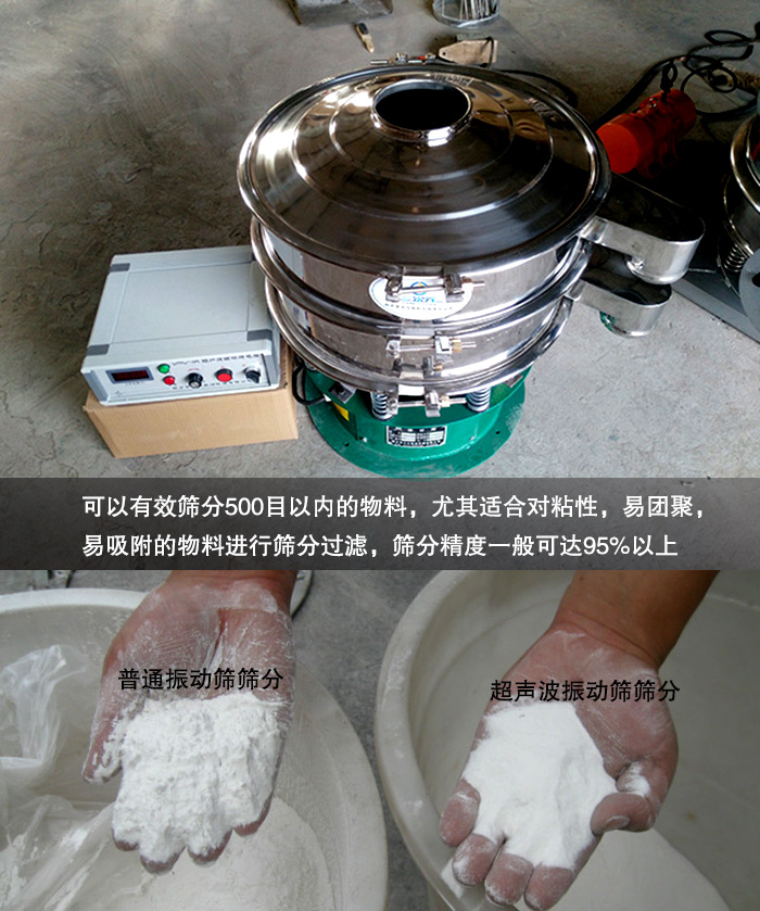 普通振動(dòng)篩主要篩分的是300目以下的物料,而超聲波振動(dòng)篩是在其基礎(chǔ)上加裝了超聲波篩分系統(tǒng),可以有效篩分500目以內(nèi)的物料,尤其適合對(duì)粘性,易團(tuán)聚,易吸附的物料進(jìn)行篩分過(guò)濾,普通振動(dòng)篩的篩分精度一般60%~70%左右,而超聲波振動(dòng)篩的篩分精度一般可達(dá)95%以上篩分精度高。