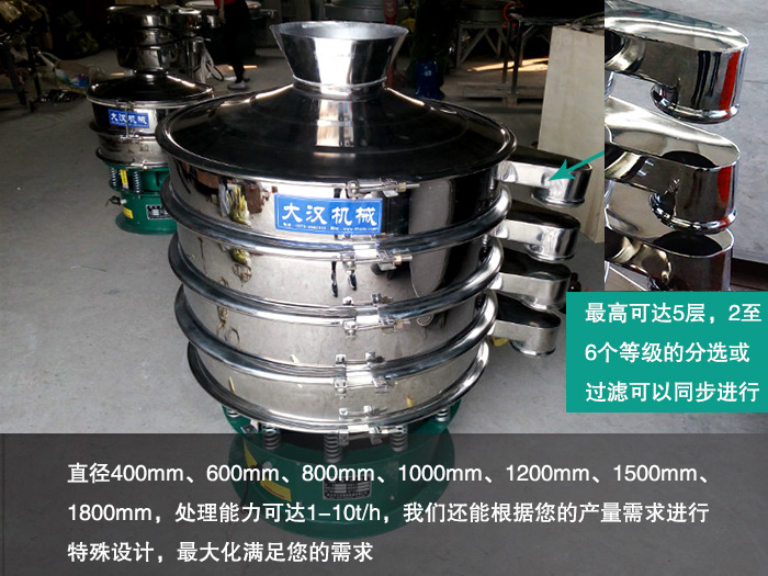 大漢多層三次元振動(dòng)篩可篩分顆粒狀、粉末狀、粘液類物料,篩分細(xì)至500目0.028mm,過濾小可至5微米,篩分精準(zhǔn),再加上多層三次元振動(dòng)篩特有的彈跳球清網(wǎng)裝置,可減少大多數(shù)物料在篩分過程中出現(xiàn)的堵網(wǎng)現(xiàn)象,提高篩分精度與篩分效率。