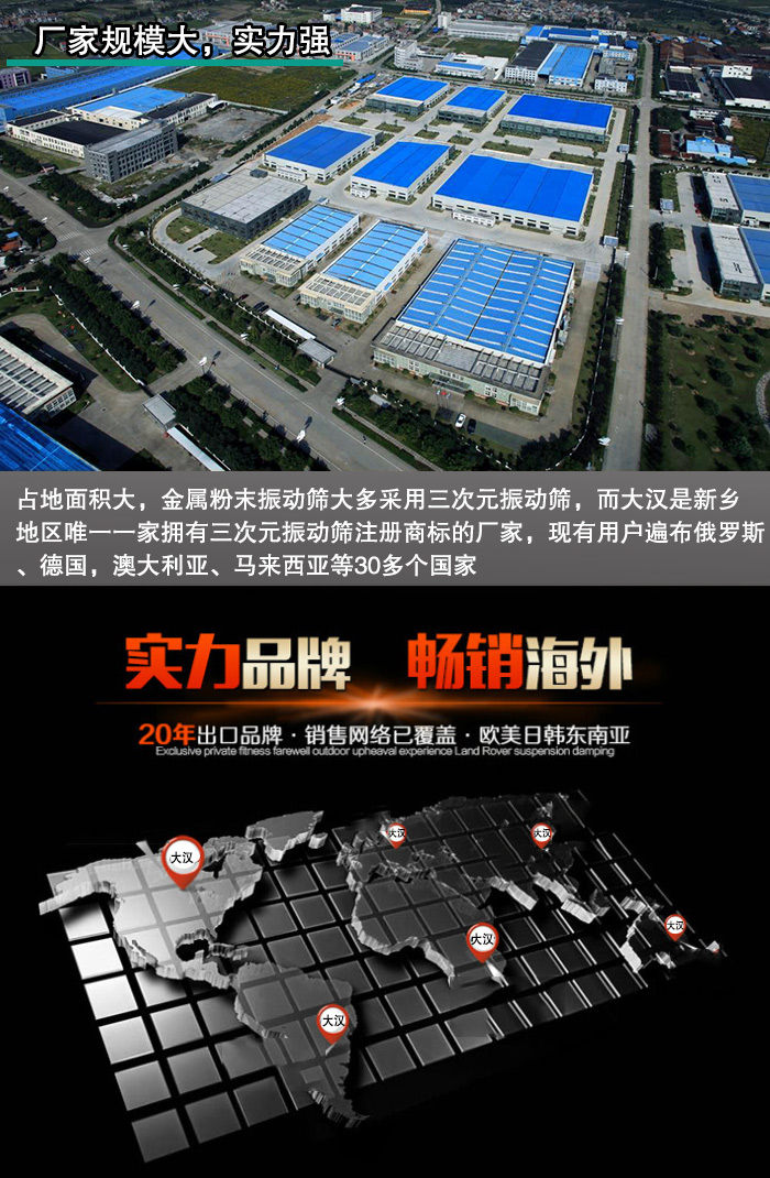 新鄉(xiāng)大漢占地10000平方米,擁有自己獨(dú)立的大型工業(yè)廠房,各種設(shè)備齊全,而且新鄉(xiāng)大漢生產(chǎn)振動(dòng)篩30余年,積累了大量的生產(chǎn)經(jīng)驗(yàn)。金屬粉末振動(dòng)篩大多采用三次元振動(dòng)篩,而大漢是新鄉(xiāng)擁有三次元振動(dòng)篩注冊商標(biāo)的廠家,專業(yè)性非常強(qiáng),現(xiàn)有用戶遍布俄羅斯、德國,澳大利亞、馬來西亞等30多個(gè)國家,用戶口碑好。
