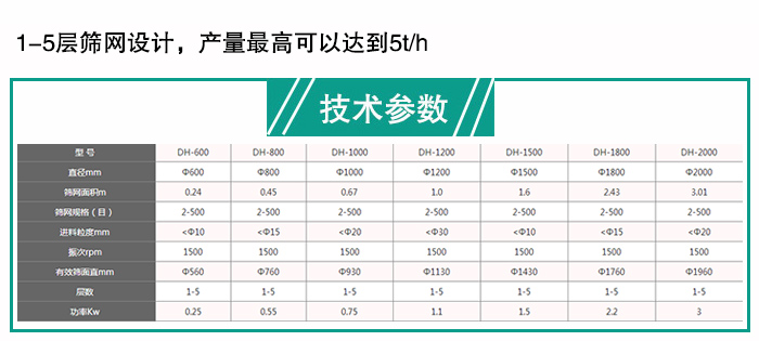 大漢生產(chǎn)的旋振篩型號包括DH-600,DH-800,DH-1000,DH-1200,DH-1500,DH-1800,DH-2000等,1-5層篩網(wǎng)設(shè)計,產(chǎn)量高可以達(dá)到5t/h,滿足石英粉時產(chǎn)5噸的要求。