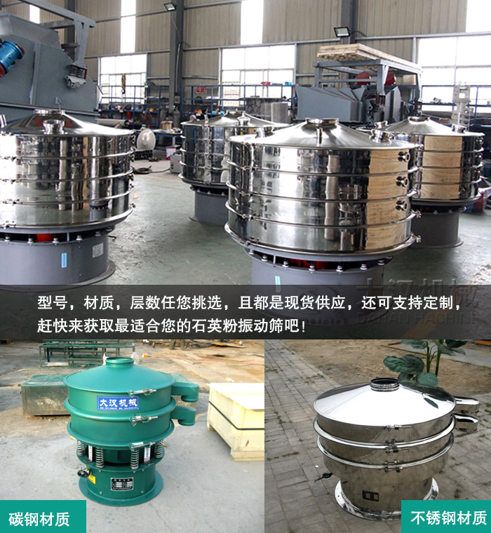 新鄉(xiāng)大漢石英粉振動篩型號種類齊全,用戶可以根據(jù)自身情況選擇合適的材質(zhì)(碳鋼/不銹鋼)、層數(shù)(1/2/3/4/5)等,且都是現(xiàn)貨供應(yīng),另外,大漢作為自產(chǎn)自銷型廠家,擁有自己的生產(chǎn)線,有足夠的能力根據(jù)用戶的實際需求進行免費設(shè)計,盡可能的滿足用戶的一切要求。