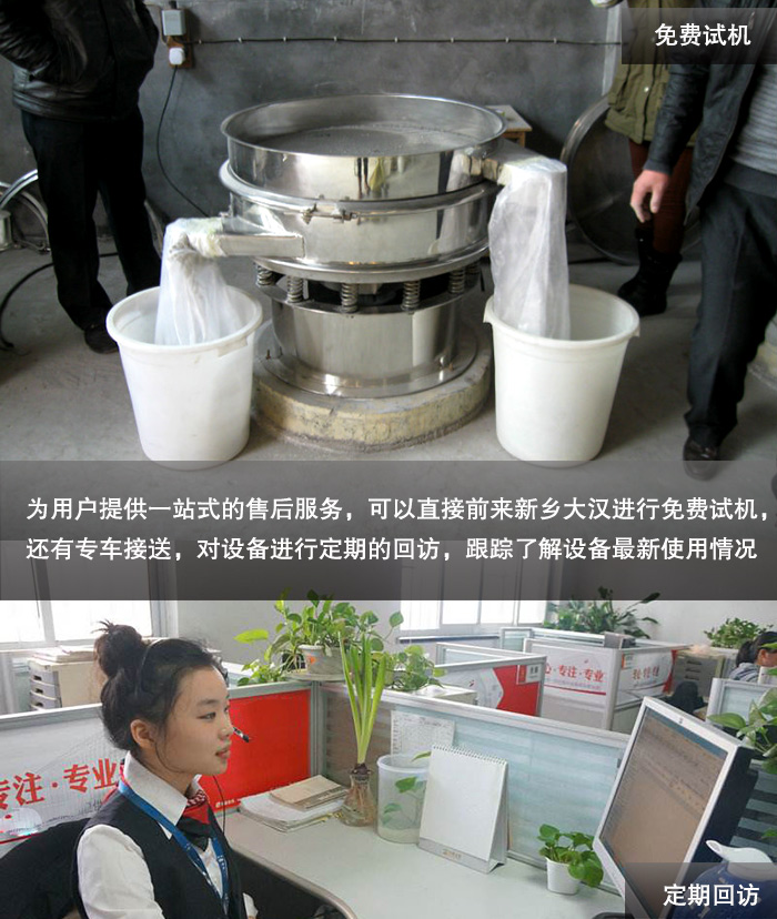 新鄉(xiāng)大漢全心全意為用戶提供一站式的售后服務(wù),如果您需要對(duì)三次元振動(dòng)篩的現(xiàn)場(chǎng)情況還不是很了解的話,可以直接前來(lái)新鄉(xiāng)大漢進(jìn)行免費(fèi)試機(jī),還有專車接送,而且大漢還會(huì)對(duì)設(shè)備進(jìn)行定期的回訪,跟蹤了解設(shè)備使用情況。