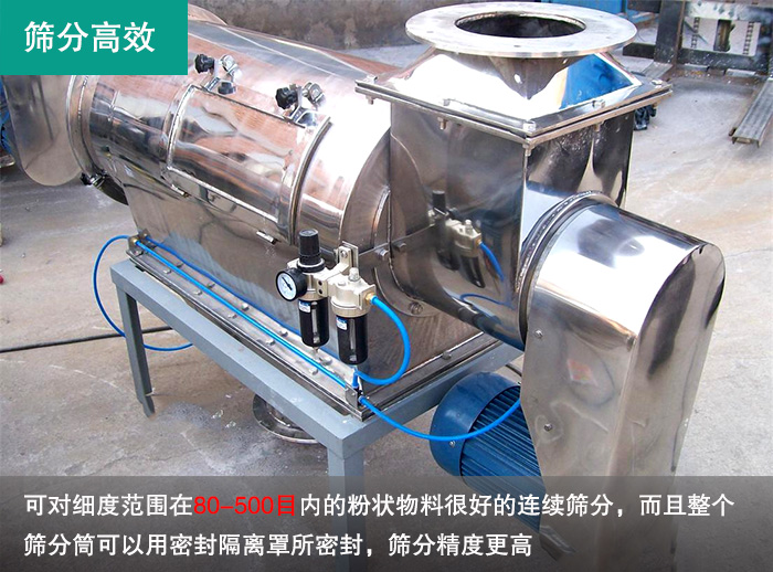 臥式氣流篩可對細度范圍在80-500目內的粉狀物料很好的連續(xù)篩分。臥式氣流篩整個篩分筒可以用密封隔離罩所密封,避免橡膠助劑在篩分循環(huán)過程中的粉塵飛揚,塊狀分濺等現(xiàn)象,影響篩分精度,而且在達到達到篩分精度的情況下,篩分效率可達到95%以上。
