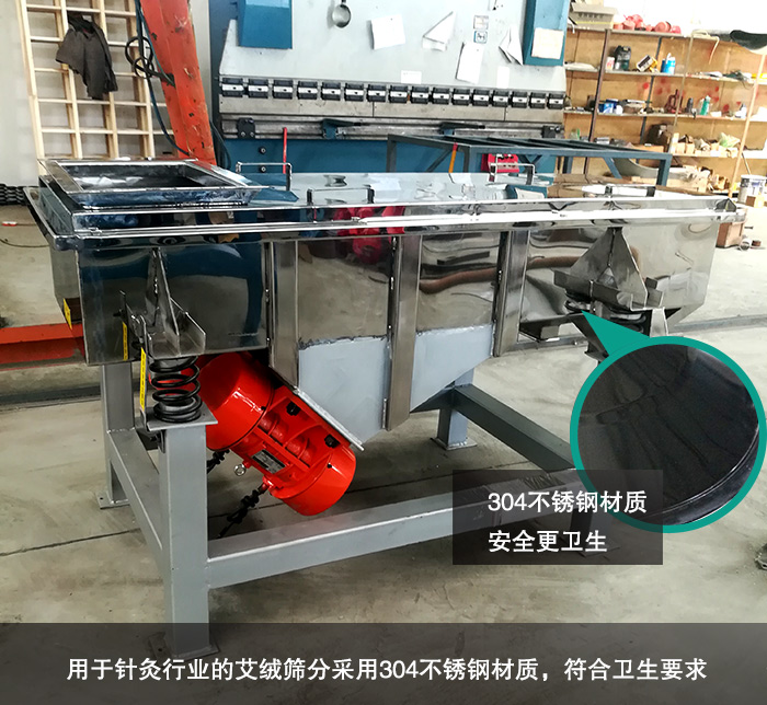 因為艾絨主要用于針灸行業(yè),所以對于衛(wèi)生要求很高,因此選擇的直線振動篩為不銹鋼材質(zhì),能夠保證更加干凈衛(wèi)生。