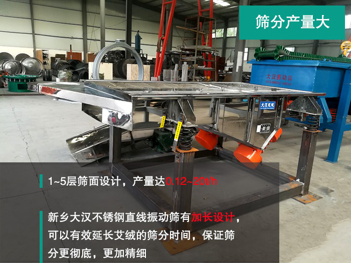 新鄉(xiāng)大漢直線振動篩可以有1~5層篩面設(shè)計,產(chǎn)量達0.12~20t/h。而且,艾絨在篩分過程中會發(fā)生團聚現(xiàn)象,新鄉(xiāng)大漢不銹鋼直線振動篩有加長設(shè)計,可以有效延長艾絨的篩分時間,保證篩分更,更加精細,可以很好地解決艾絨的篩分難題。
