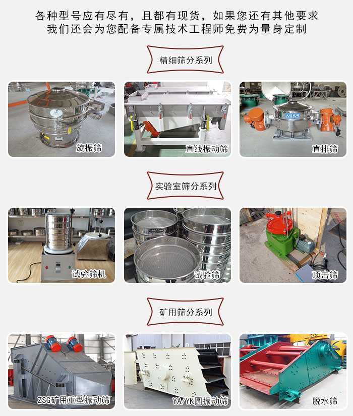 大漢廠家生產的振動篩主要針對精細篩分,實驗室篩分,礦用篩分等多種不同的場景,該設備種類型號多樣,有幾百種型號可供您選擇,且都有現(xiàn)貨,如果您還有其他要求,我們還會為您配備專屬技術工程師免費為量身定制。