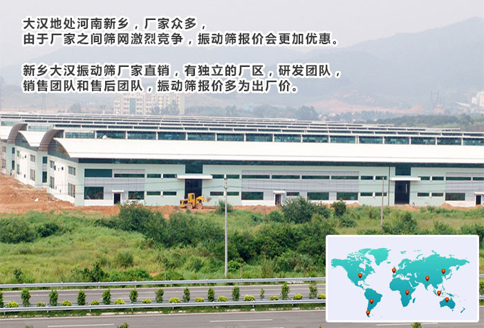 河南新鄉(xiāng)市是生產振動篩的基地,被譽為“振動篩之鄉(xiāng)”,就新鄉(xiāng)市而言,生產振動篩設備的廠家大大小小就有上千家,是個選購振動篩的好去處。但是這其中也不乏一些小作坊,所以建議大家在選購振動篩設備時還是實地參觀為妙。這里為您推薦我們新鄉(xiāng)大漢振動機械有限公司: